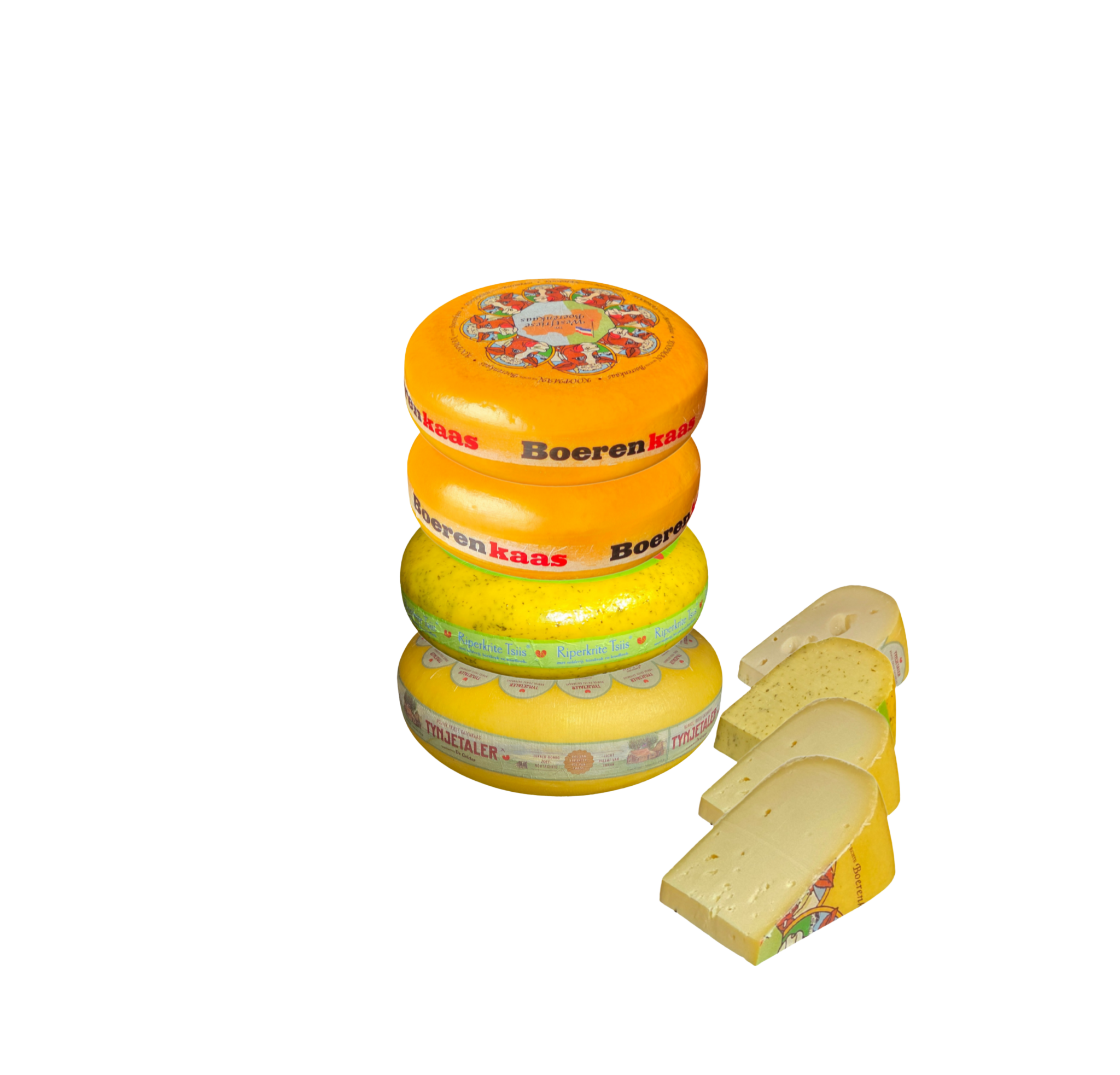 Op deze pagina; pakketten met vier stukken kaas, gemaakt op de boerderij.