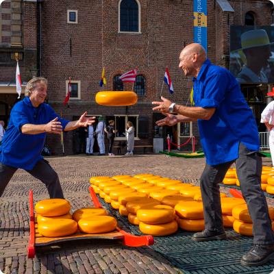 Verwacht live demonstraties van kaasdragers, handjeklap-onderhandelingen en het wegen van kaas in het historische Waaggebouw, een levendige traditie sinds 1593.